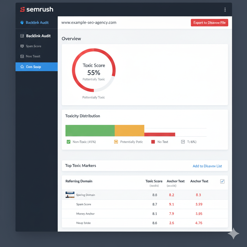 - Add to Disavow List: In Semrush, you can add individual URLs or entire domains to your “Disavow List” directly from the audit report. This makes building your disavow file much easier.